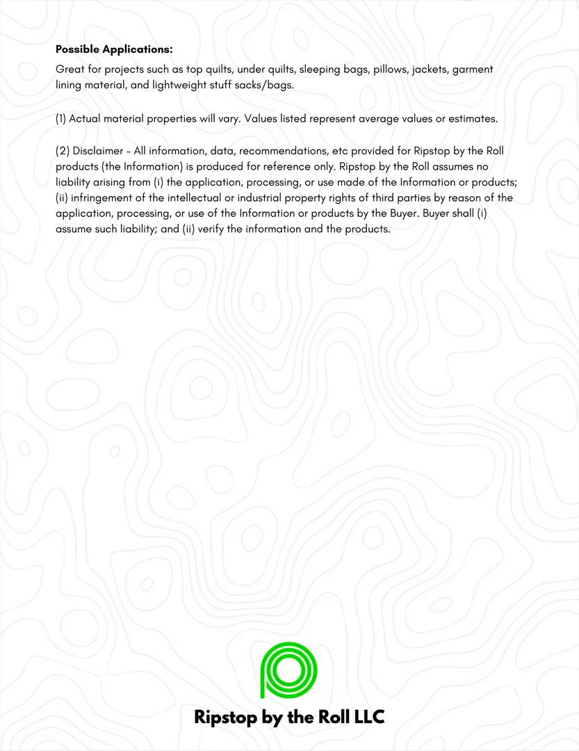 Great for projects such as top quilts, under quilts, sleeping bags, pillows, jackets, garment lining material, and lightweight stuff sacks/bags.